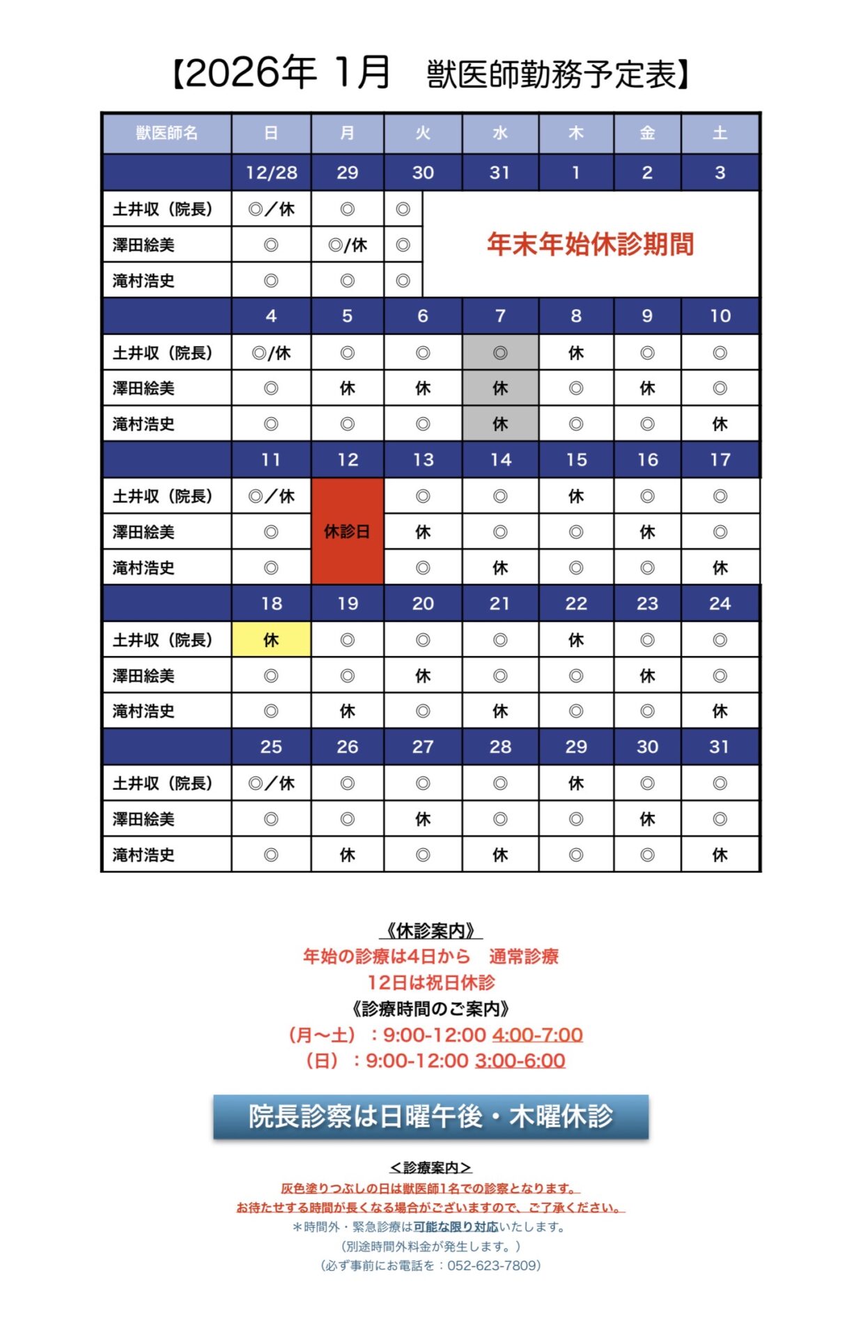 本年もよろしくお願い申し上げます。1月の獣医師勤務予定表を更新いたしました。