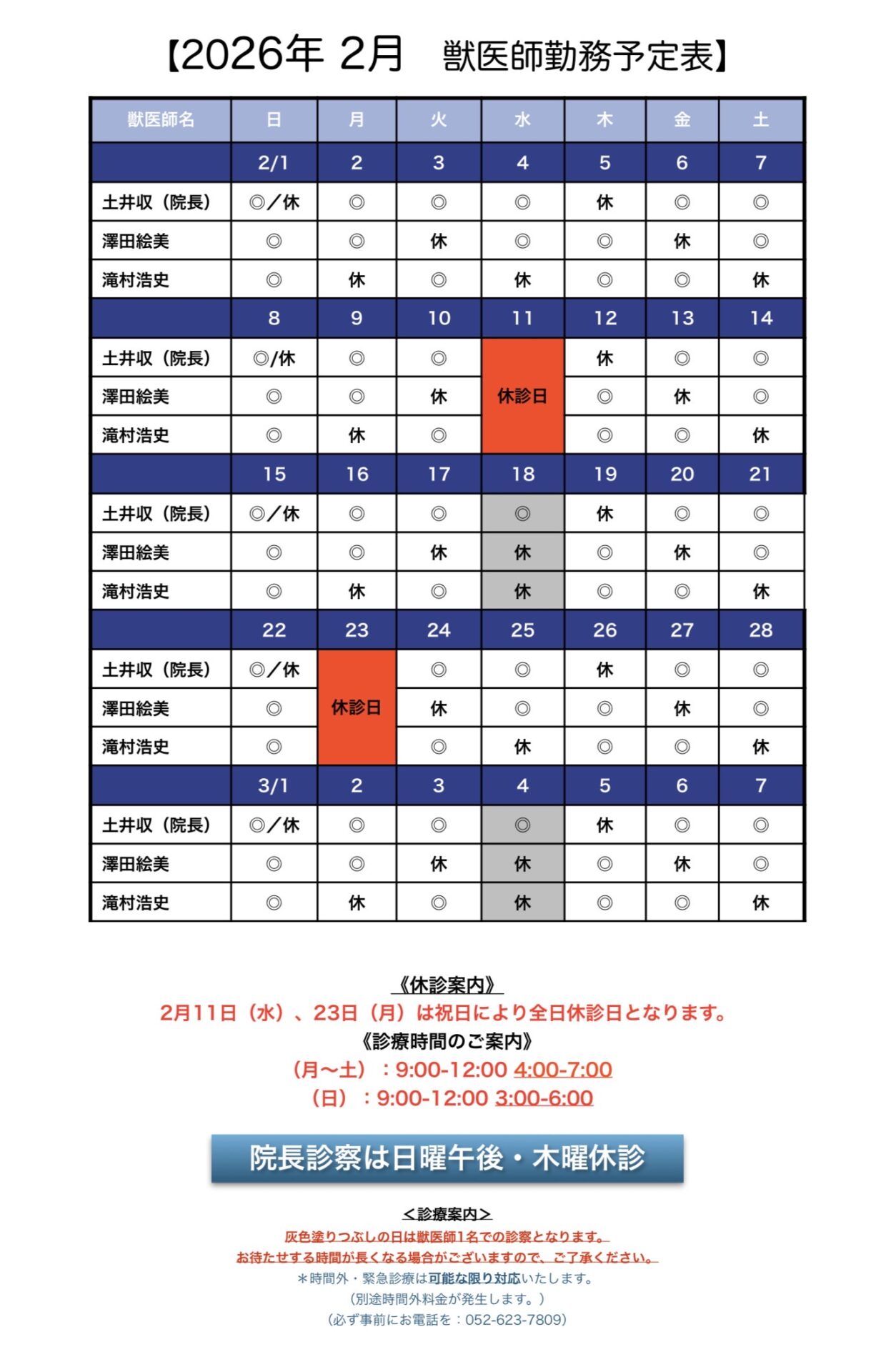 [【更新】 2月獣医師勤務予定表 更新しました]