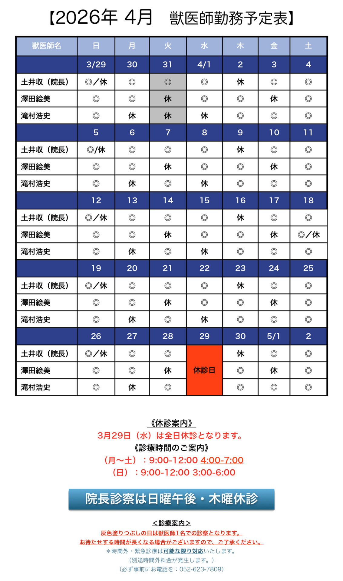 ブログ【予定表】4月 獣医師勤務予定表 更新しました